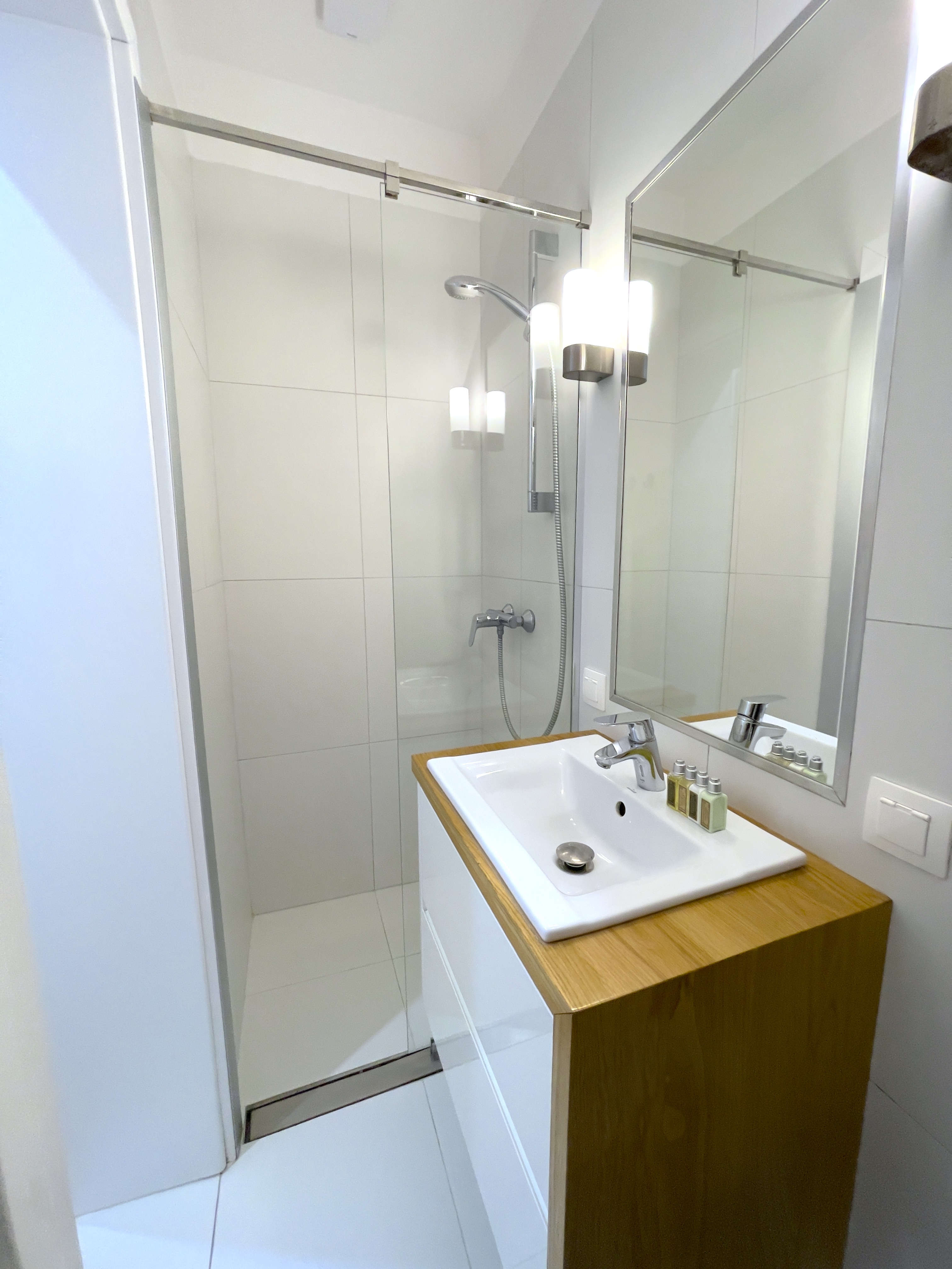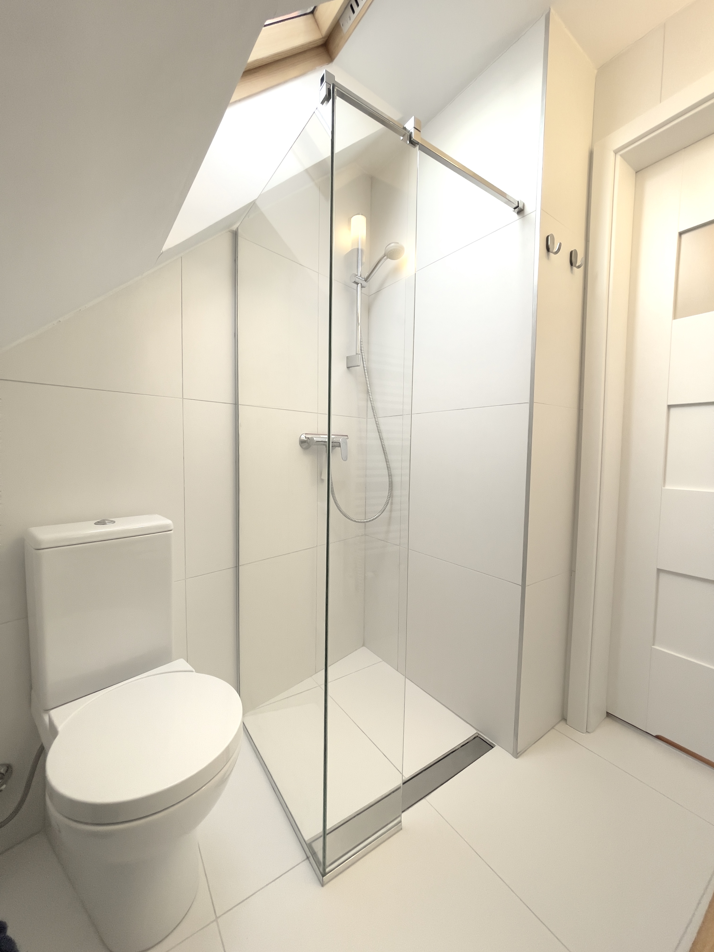 Łazienka: prysznic, szafka z umywalką, pralka, suszarka do włosów.