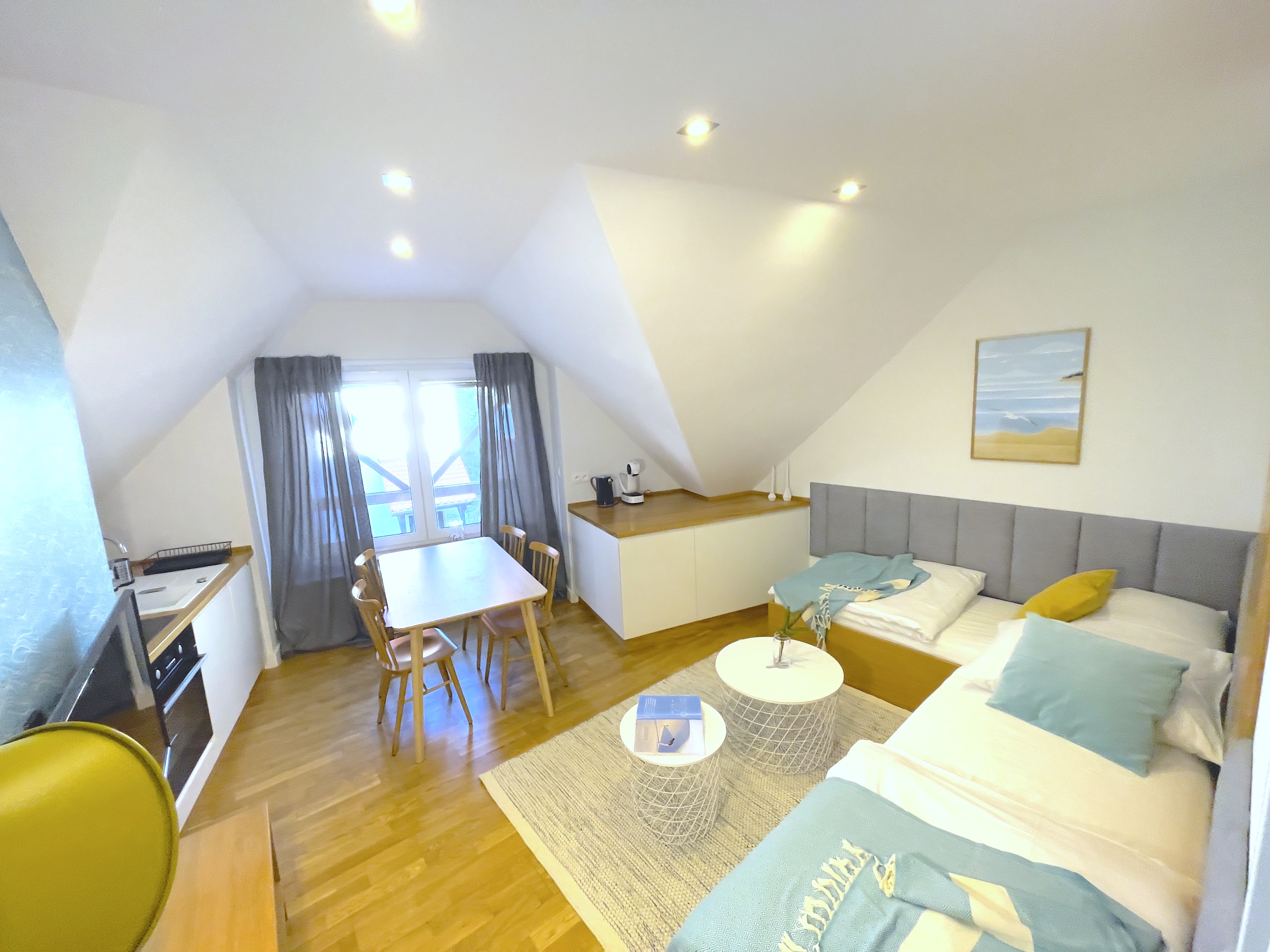 Salon: dwa łóżka jednoosobowe z bardzo wygodnymi materacami, które w ciągu dnia pełnią funkcję wypoczynku, szafa wnękowa, ława, szafka RTV, telewizor.