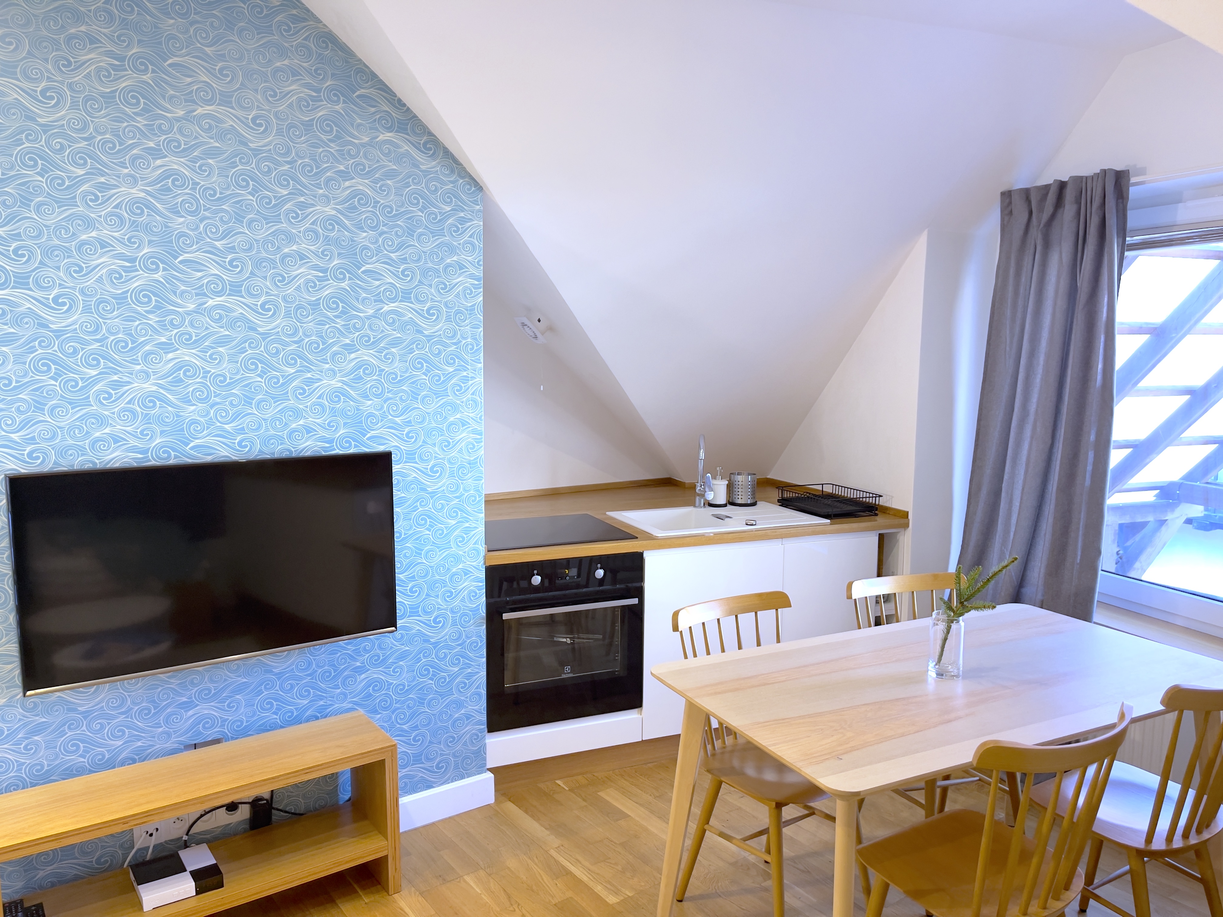 Aneks kuchenny wyposażony jest w stół z krzesłami, płytę indukcyjną, lodówkę, zmywarkę, piekarnik oraz ekspres do kawy i czajnik. Do dyspozycji Gości zastawa stołowa, sztućce, garnki, patelnie, naczynia i przybory zazwyczaj używane w kuchni.