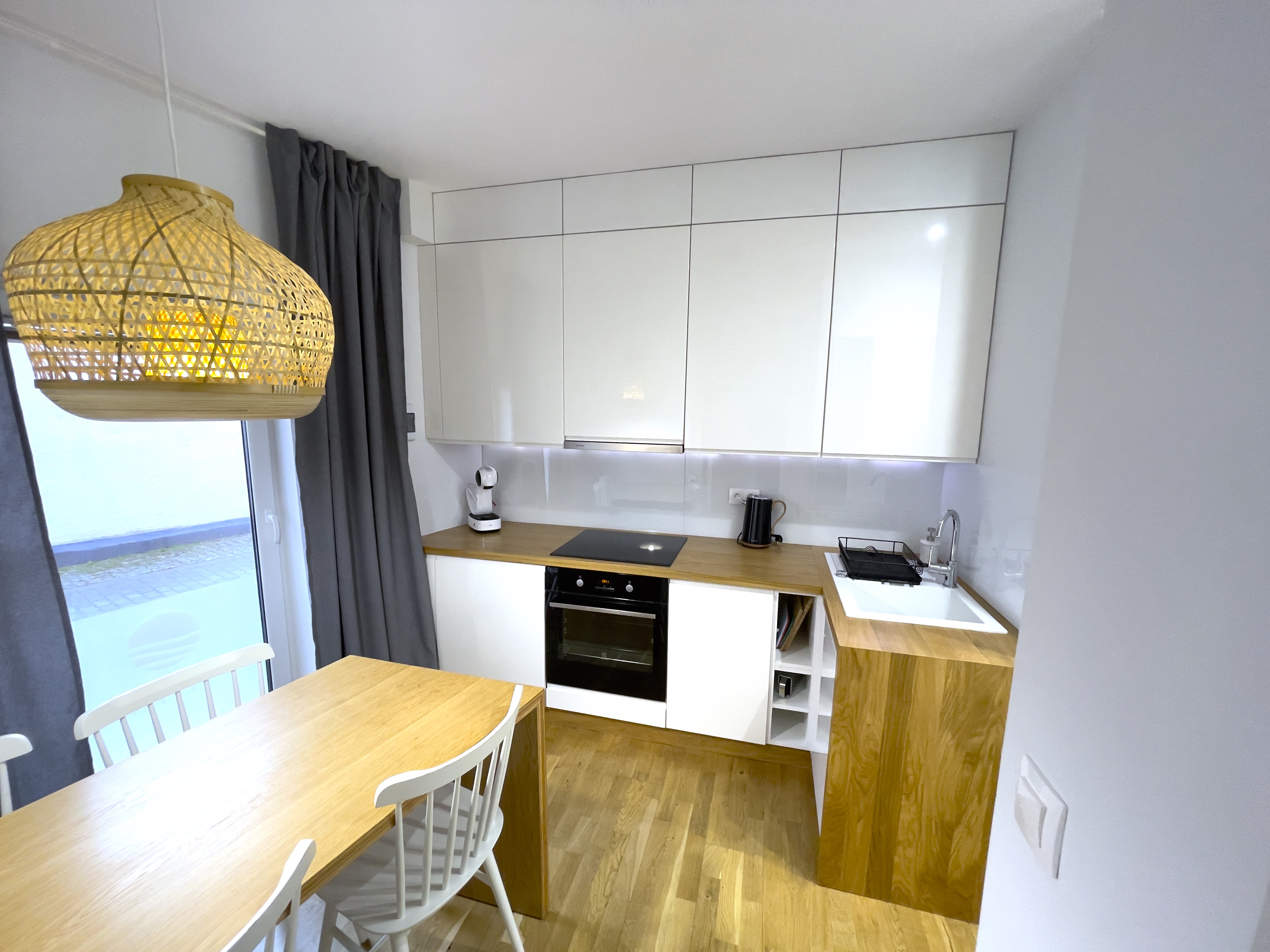 Aneks kuchenny: płyta indukcyjna, piekarnik, zmywarka, lodówka, ekspres do kawy, czajnik, zastawa stołowa, sztućce, garnki, przybory kuchenne.